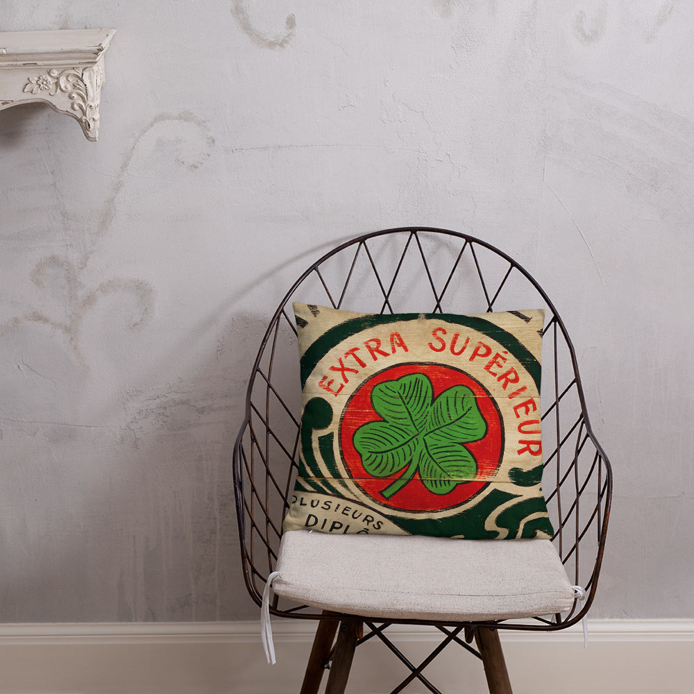 18 x 18 Lucky Clover Throw Pillow. A strategically placed accent can bring the whole room to life, and this 18 x 18 lucky clover throw pillow is just what you need to do that. What's more, the soft, machine-washable case with the shape-retaining insert is a joy to have long afternoon naps on. Our hand painted vintage lucky clover art is printed on both sides for double the enjoyment. This vintage design is great for St. Patrick's Day.